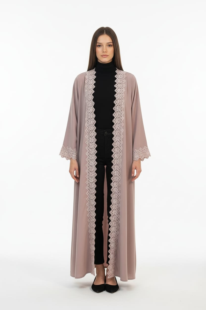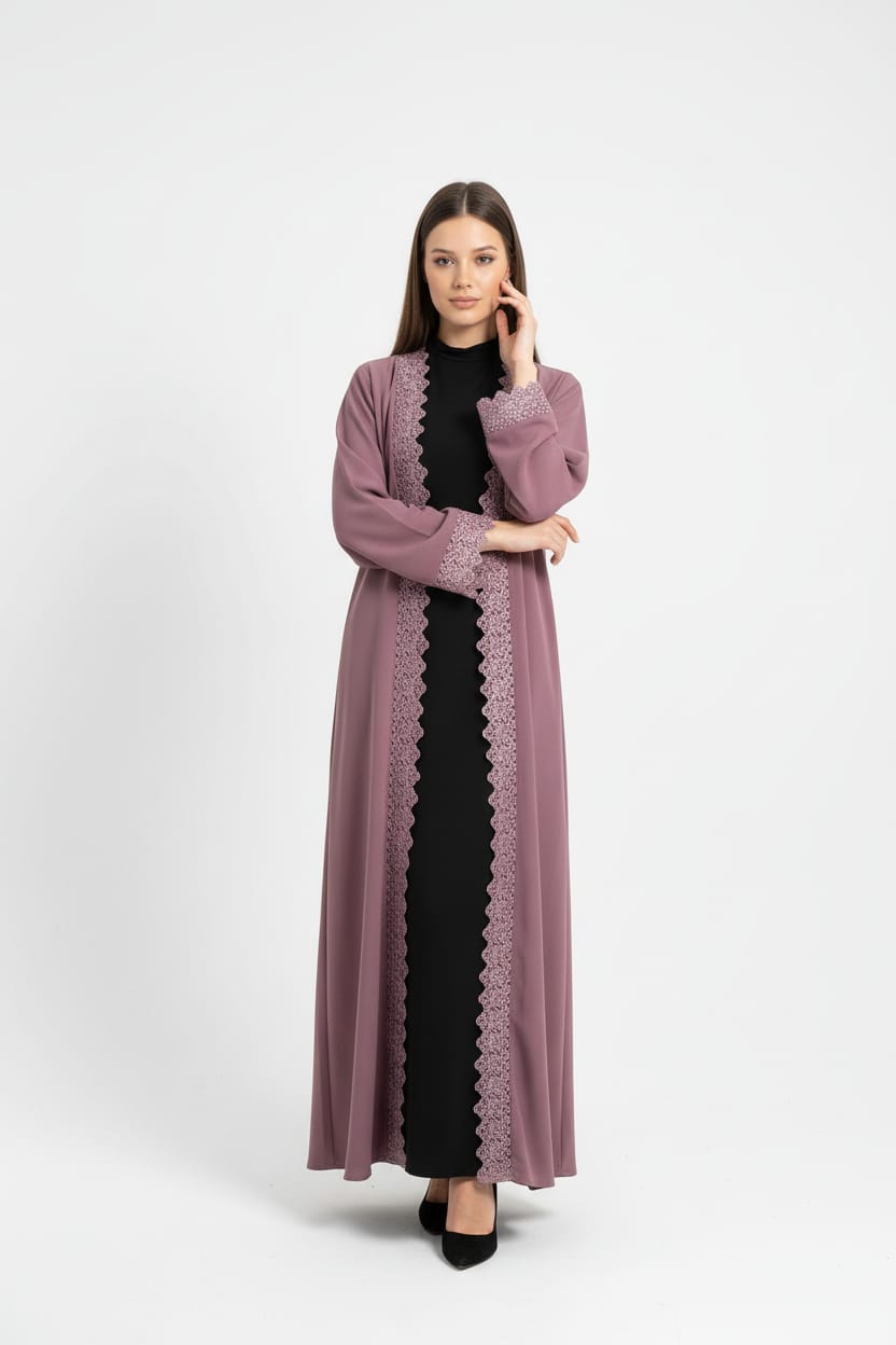 A daily wear abaya crafted from Indonesian crepe, available in three colors, adorned with refined lace detailing on the neckline, sleeves, and back in a matching shade that offers a look of effortless, understated elegance.