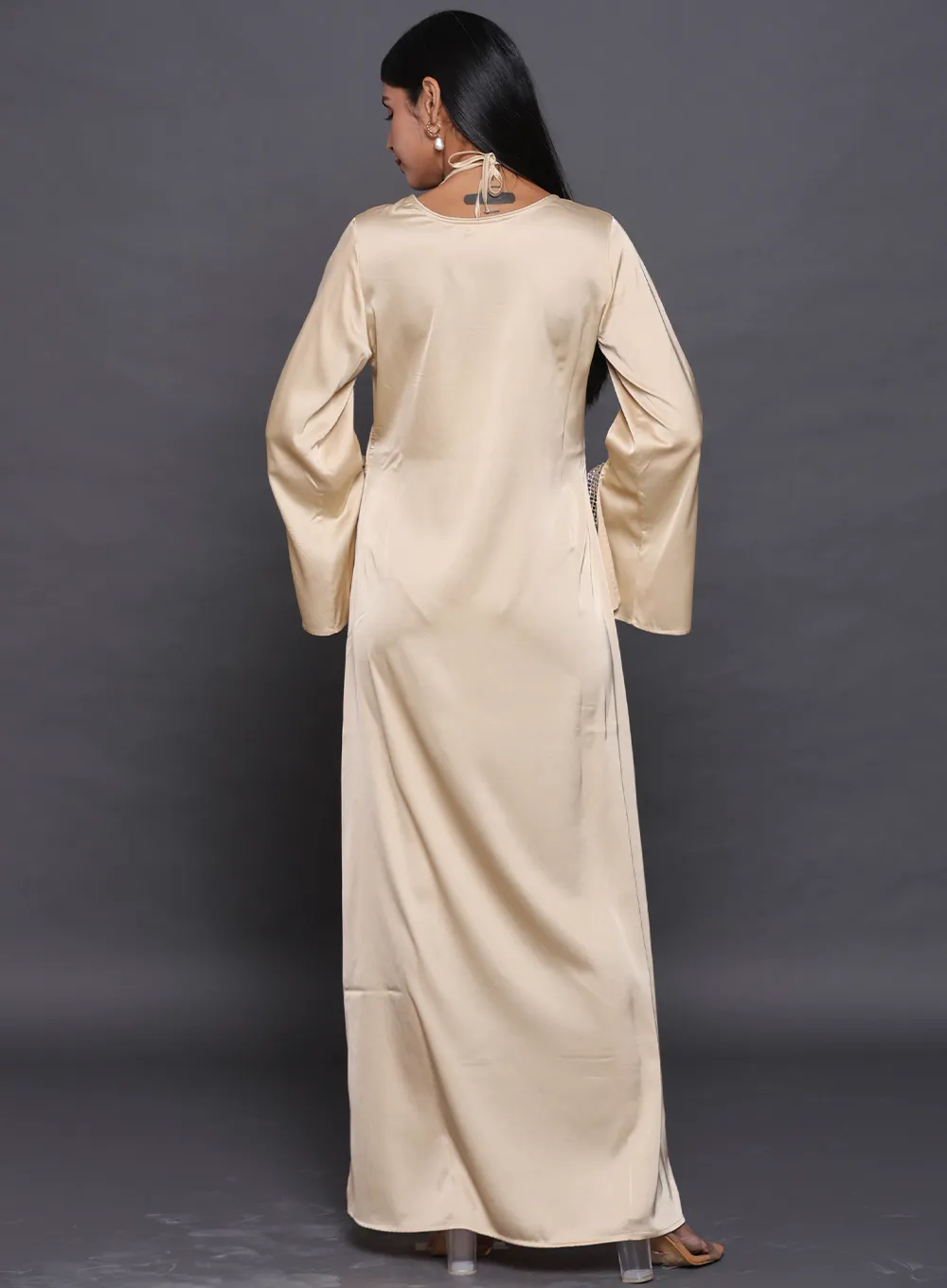 A luxurious beige Armani satin dress featuring an elegant design with long sleeves and a rhinestone-studded neckline that adds sparkle and beauty, making it the perfect choice for glamorous occasions.