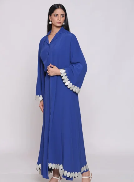 A luxurious abaya crafted from high-quality Korean crepe, featuring a fluid design with soft, refined detailing thoughtfully placed throughout the piece—adding a subtle touch of sophistication.