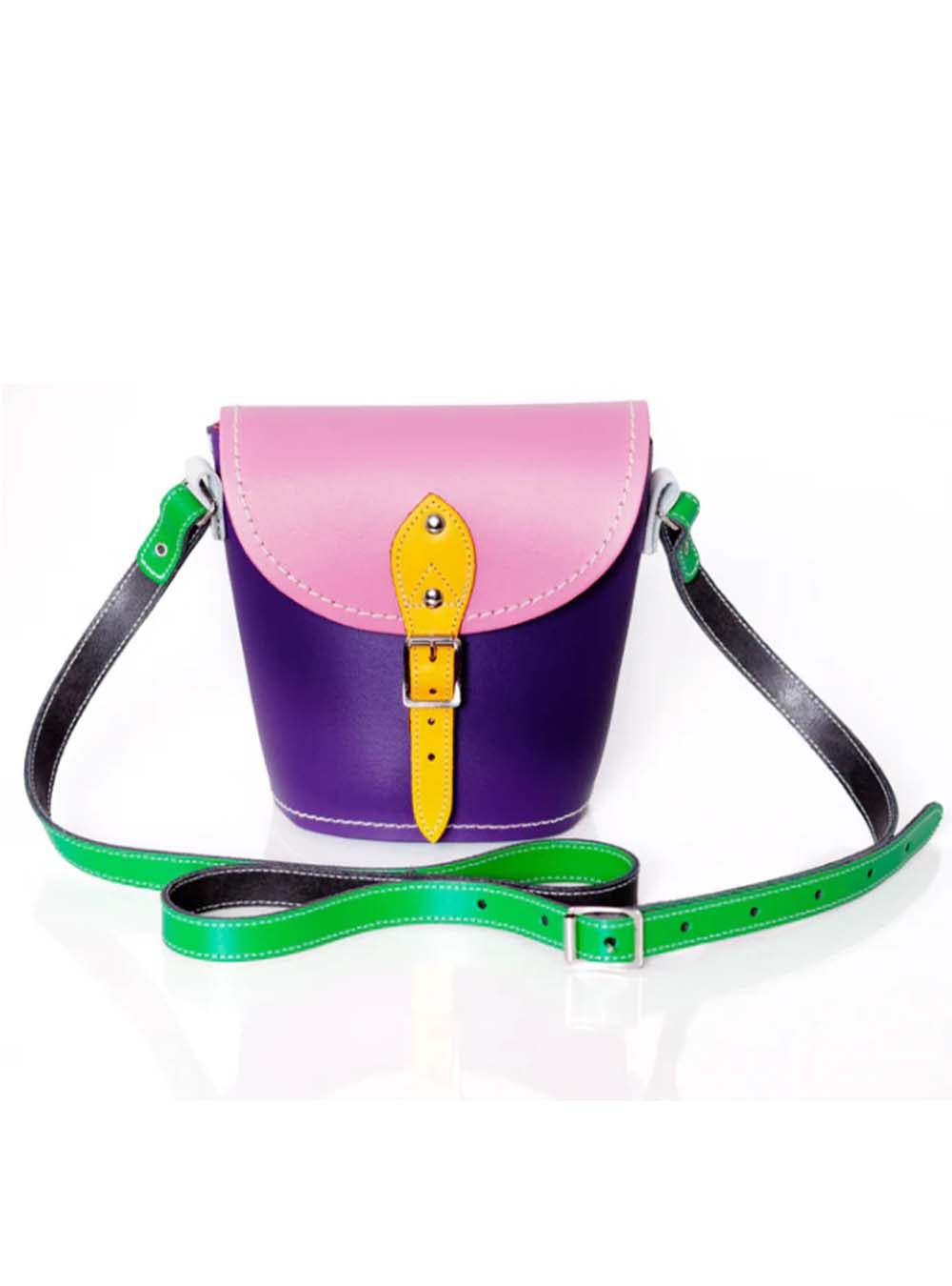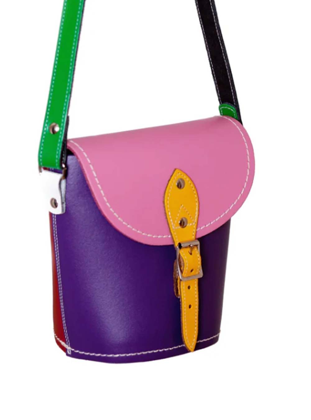 This vibrant Multicoloured Barrel Bag is handmade in England from premium leather using traditional craftsmanship. Each panel features a different shade, creating a kaleidoscope of colors. It includes a traditional buckle fastening, white hand stitching, and an adjustable crossbody strap. Available in small and Plus sizes, with optional magnetic fastening and personalized engraving. Perfect for carrying essentials in style.