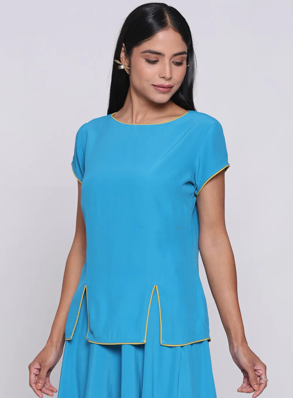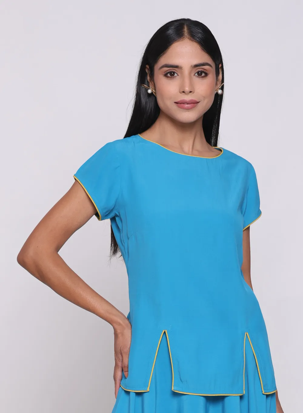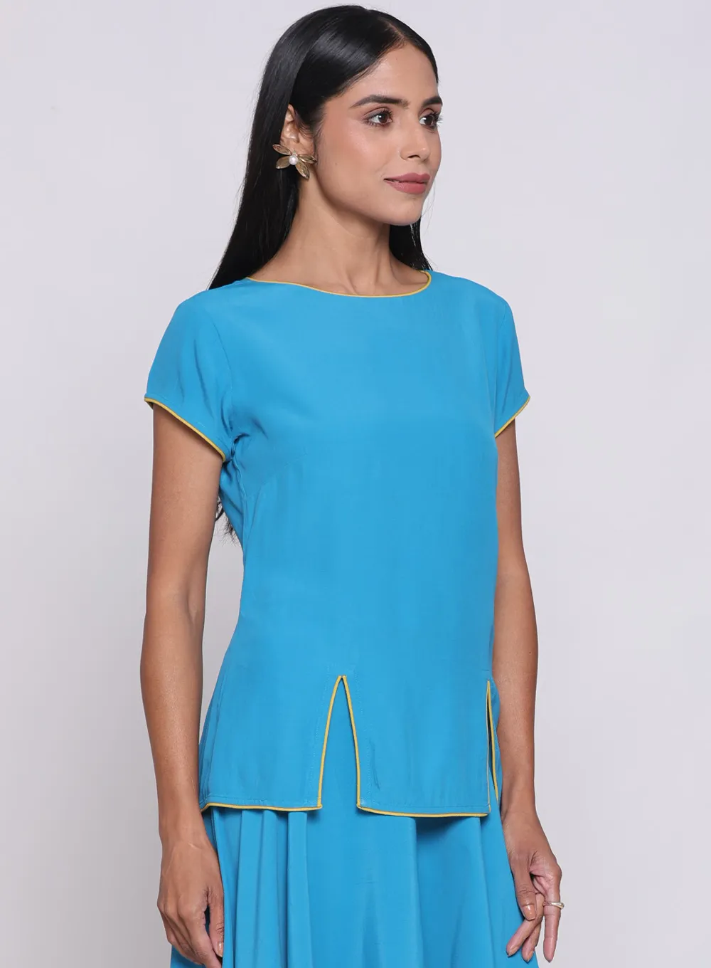 Shine with elegance in this distinctive piece made from light sky blue crepe fabric. Its luxurious material offers comfort and confidence, adding a touch of beauty to your look for every occasion.