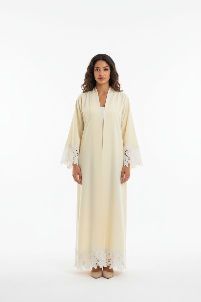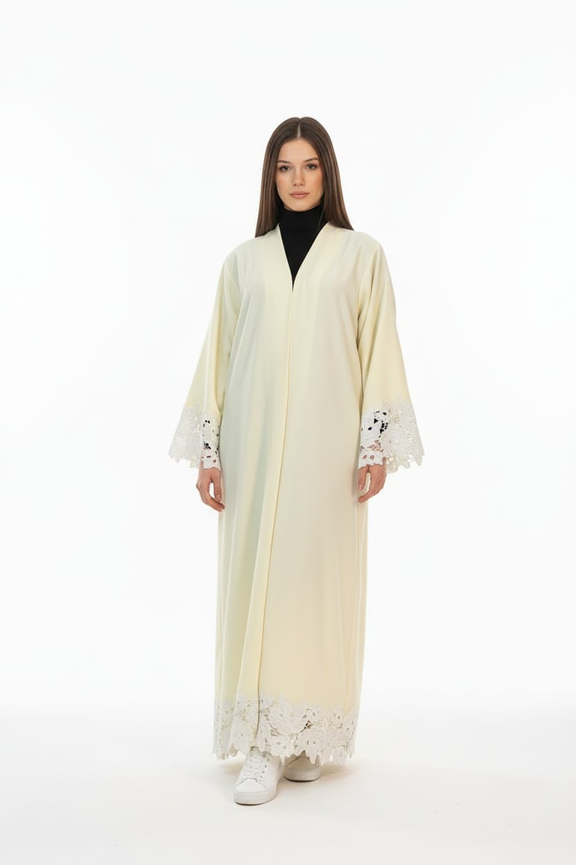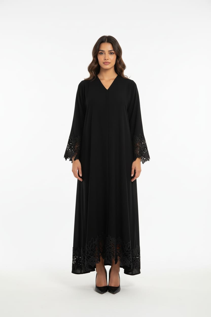 An elegant Korean crepe abaya available in three colors, featuring velvet-embellished lace detailing on the sleeves and hem for a look that exudes refined sophistication.