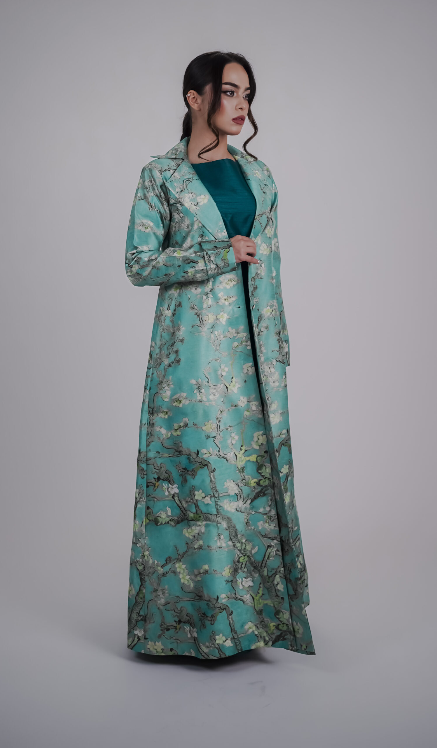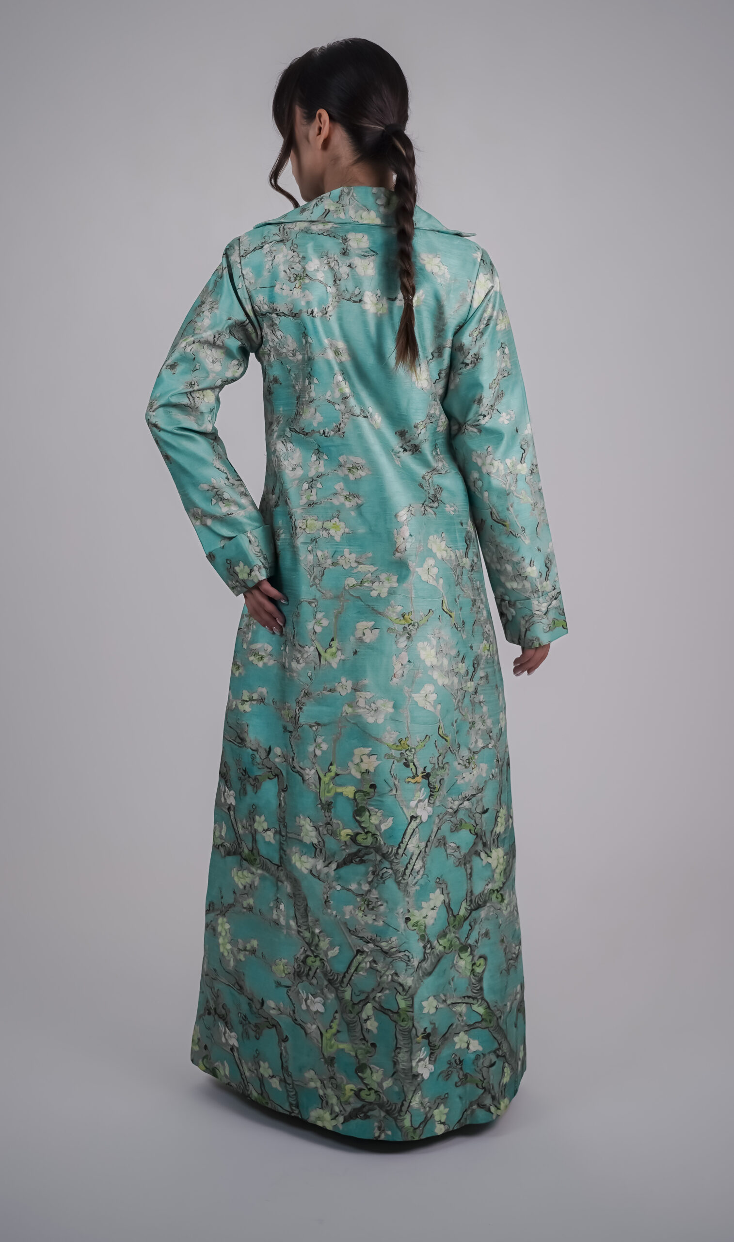 A luxurious abaya with an elegant design inspired by Van Gogh’s “Almond Blossoms,” featuring fluid patterns reminiscent of almond blossoms, adding depth and sophistication.