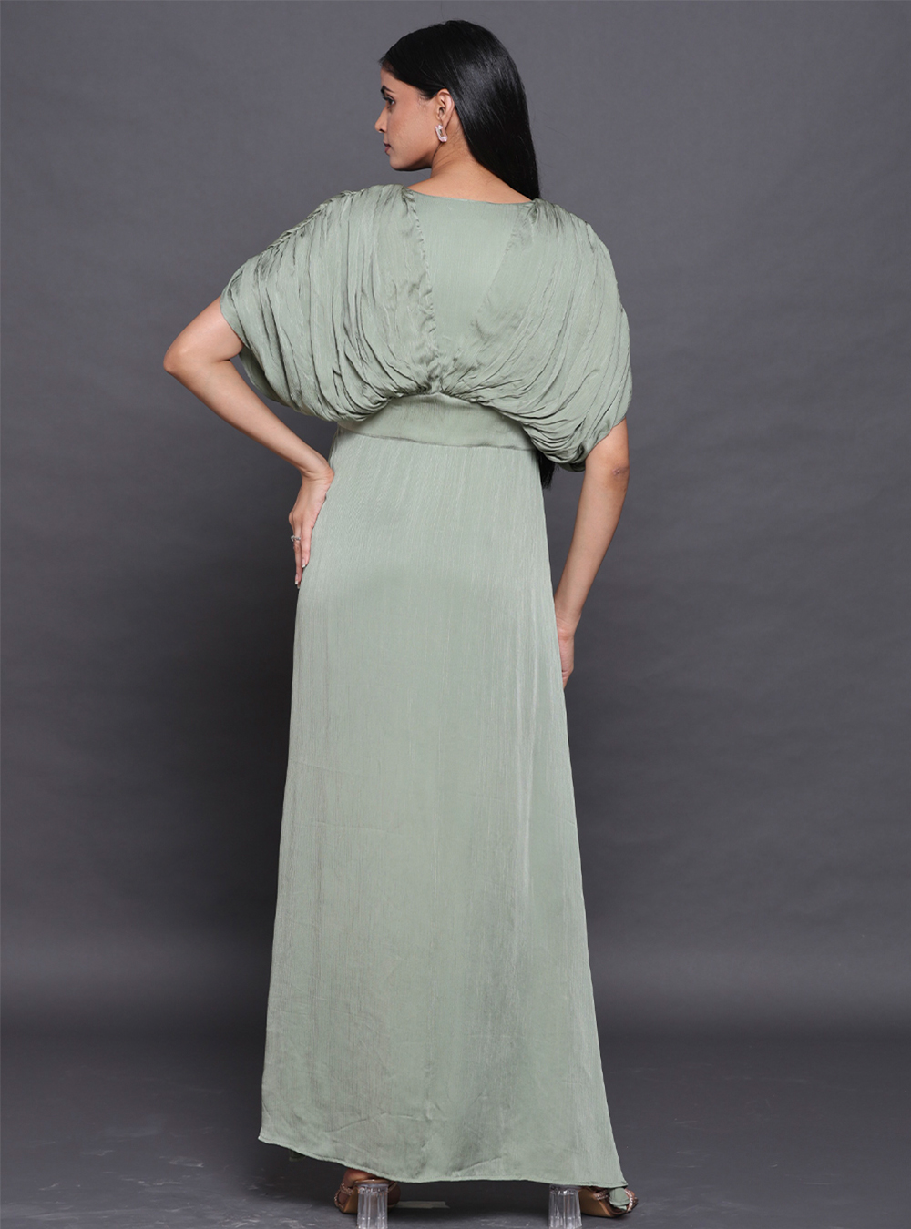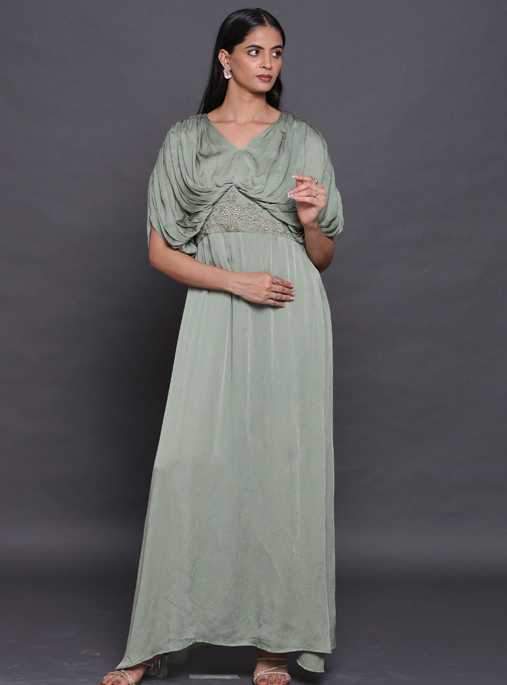 An elegant green dress made from chiffon fabric, designed in a kaftan style that combines luxury and comfort. Featuring soft details, it o021ffers a stunning and distinctive look for any occasion.