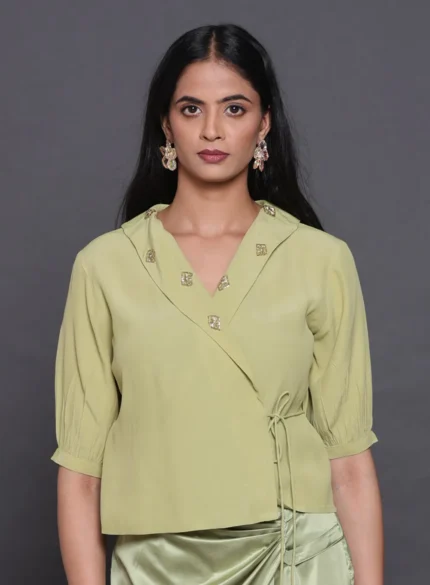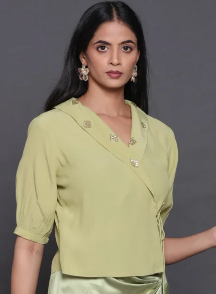 Feminine Armani satin top with a wrap-over design, long sleeves, and a chic waist tie for a flattering silhouette.