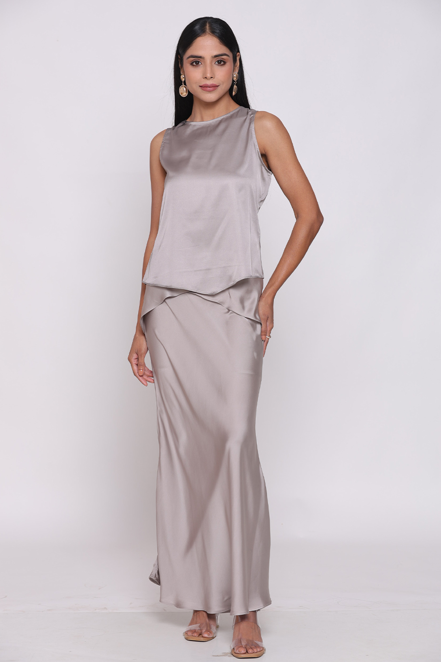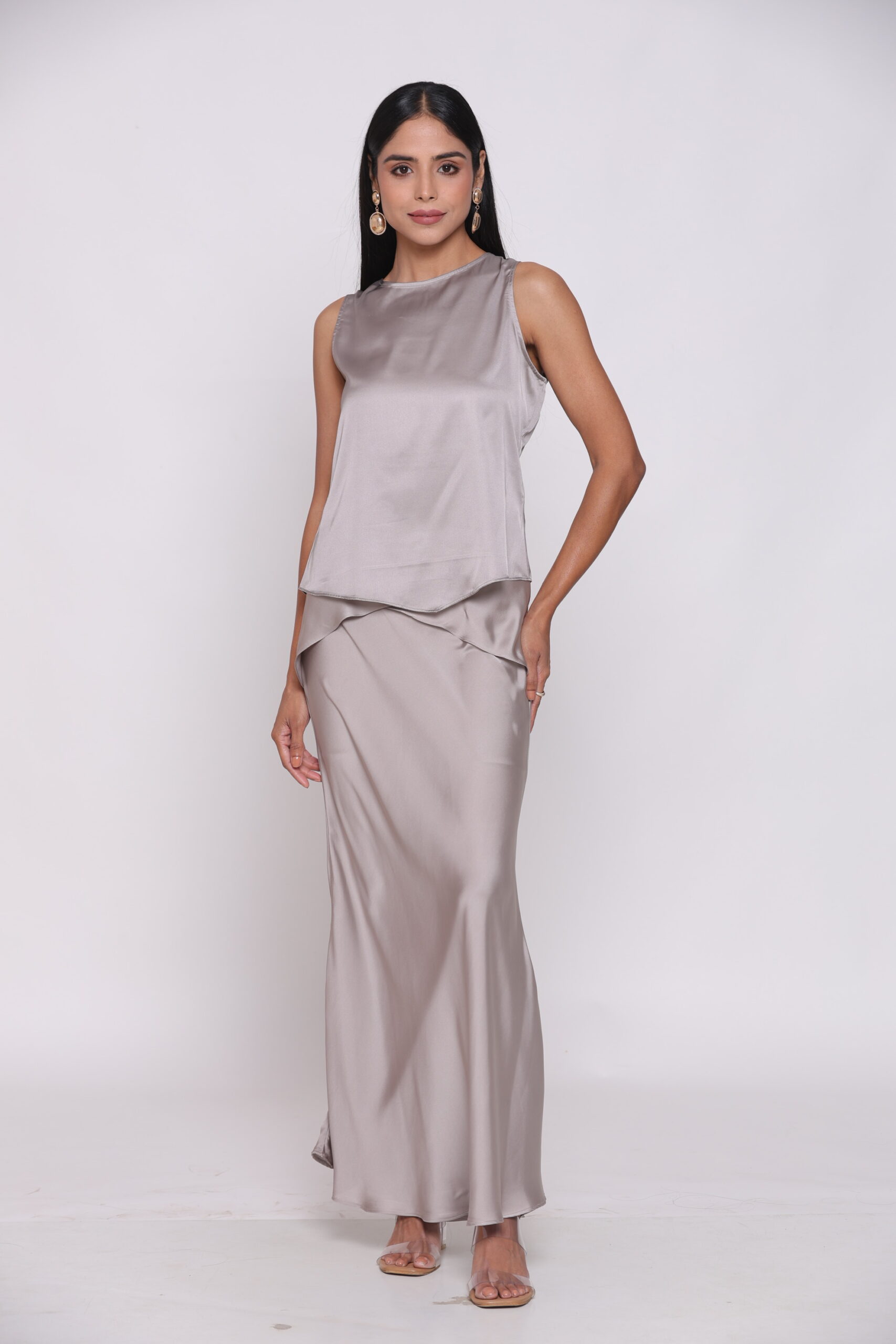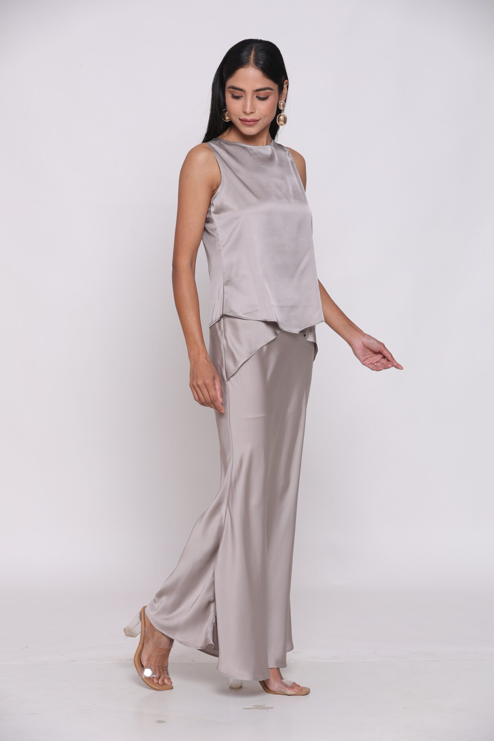 طقم رمادي أنيق مصنوع من ساتان أرماني الفاخر، يضيف لمسة ناعمة ومشرقة إلى إطلالتك.