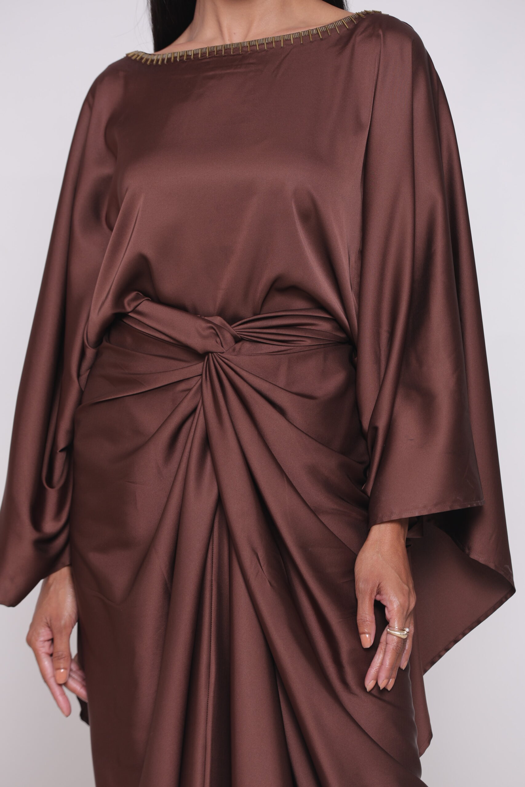 اختاري الأناقة الخالدة مع هذا الطقم من التنورة الملفوفة المصنوعة من ساتان أرماني الفاخر باللون البني، حيث يجمع تصميمها بين الراحة والفخامة. تصميمها العصري يمنحك إطلالة آسرة تجعلها الخيار المثالي لكل مناسبة.
