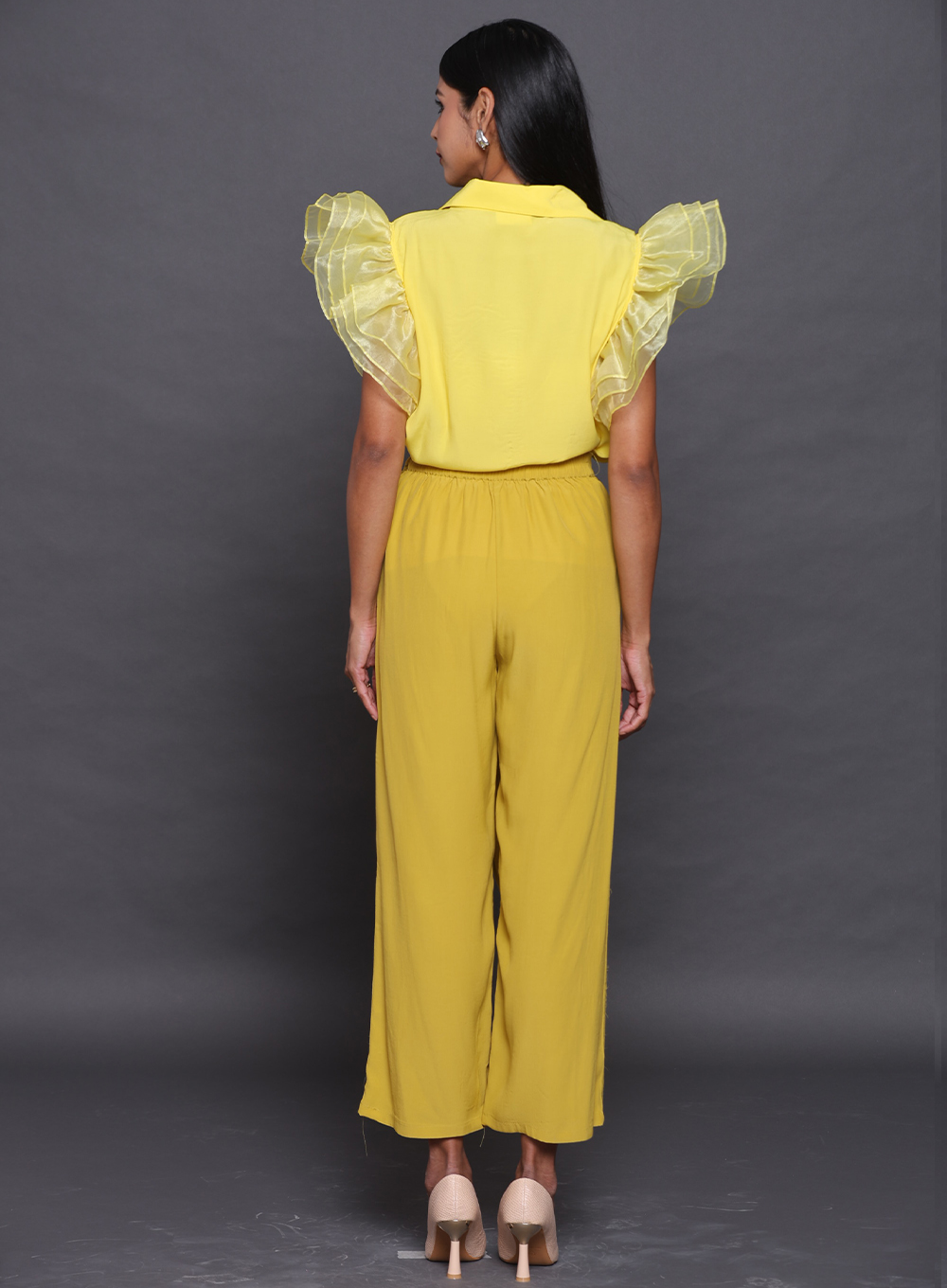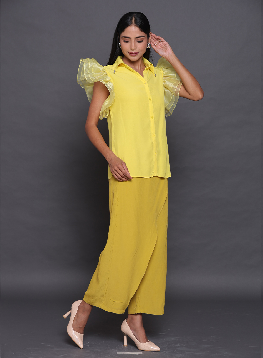 طقم باللون الأصفر مصنوع من قماش الكريب، ما يمنحك مظهرًا متناسقًا وانسيابيًا. يتميز تصميمها بالراحة والمرونة، لتشعري بالثقة والانطلاق مع لمسة من الأناقة التي تناسب جميع المناسبات.