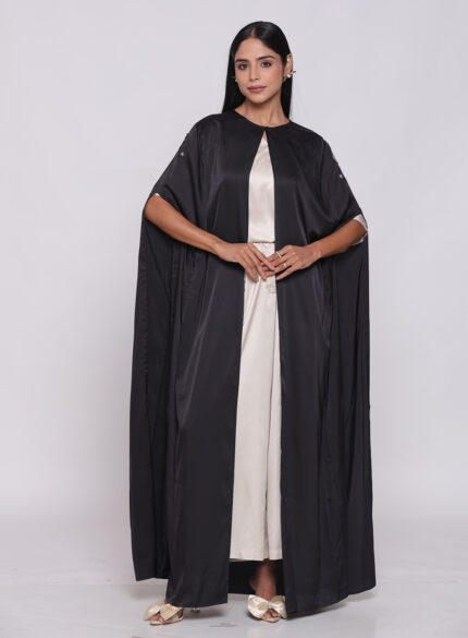 تميّزي بإطلالة أنيقة مع هذه العباءة الفخمة باللون الأسود الكلاسيكي، والمصنوعة من خامة الكريب الكوري عالية الجودة، التي تجمع بين الانسيابية والفخامة.
