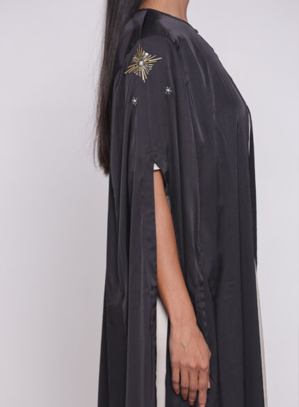 يُرافق العباءة فستان ناعم من الساتان الأرماني الفاخر، بلون متناغم مع البطانة، ليمنحك إطلالة متكاملة تنبض بالأنوثة والرقي. كما تأتي مع حزام مُطرّز بنفس نقشة وتفاصيل تطريز العباءة، لتُبرز الخصر بأناقة وتكامل.