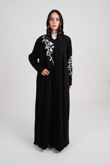 تتزيّن العباءة بتطريز فاخر وشك راقٍ يضفي لمسة فنية ساحرة على التصميم، وتأتي مبطنة من الداخل بشيفون ناعم بألوان هادئة تنسجم مع التفاصيل الراقية.