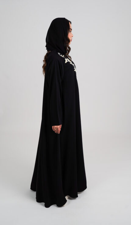 عباءة بسيطة بتصميم أنيق وانسيابي، مصنوعة من خامة الكريب الإندونيسي الخفيفة والمريحة.