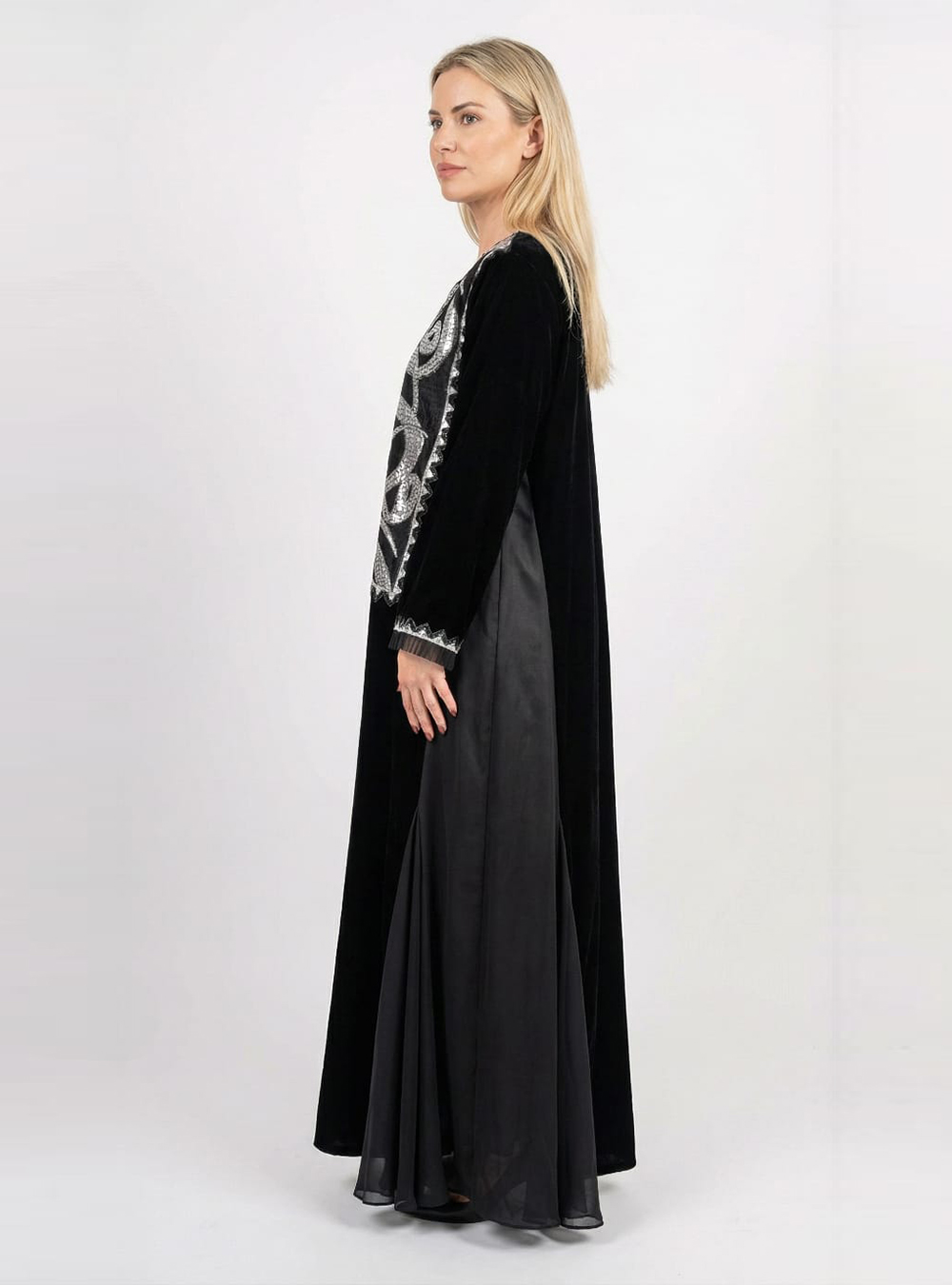 جلابية طويلة مصممة من المخمل الفخم، تعكس الأناقة الراقية والهيبة الخاصة بموسم رمضان وعيد الفطر.