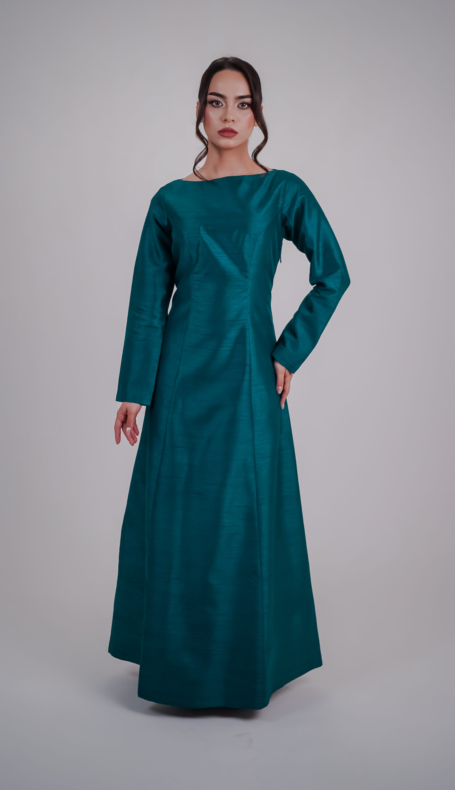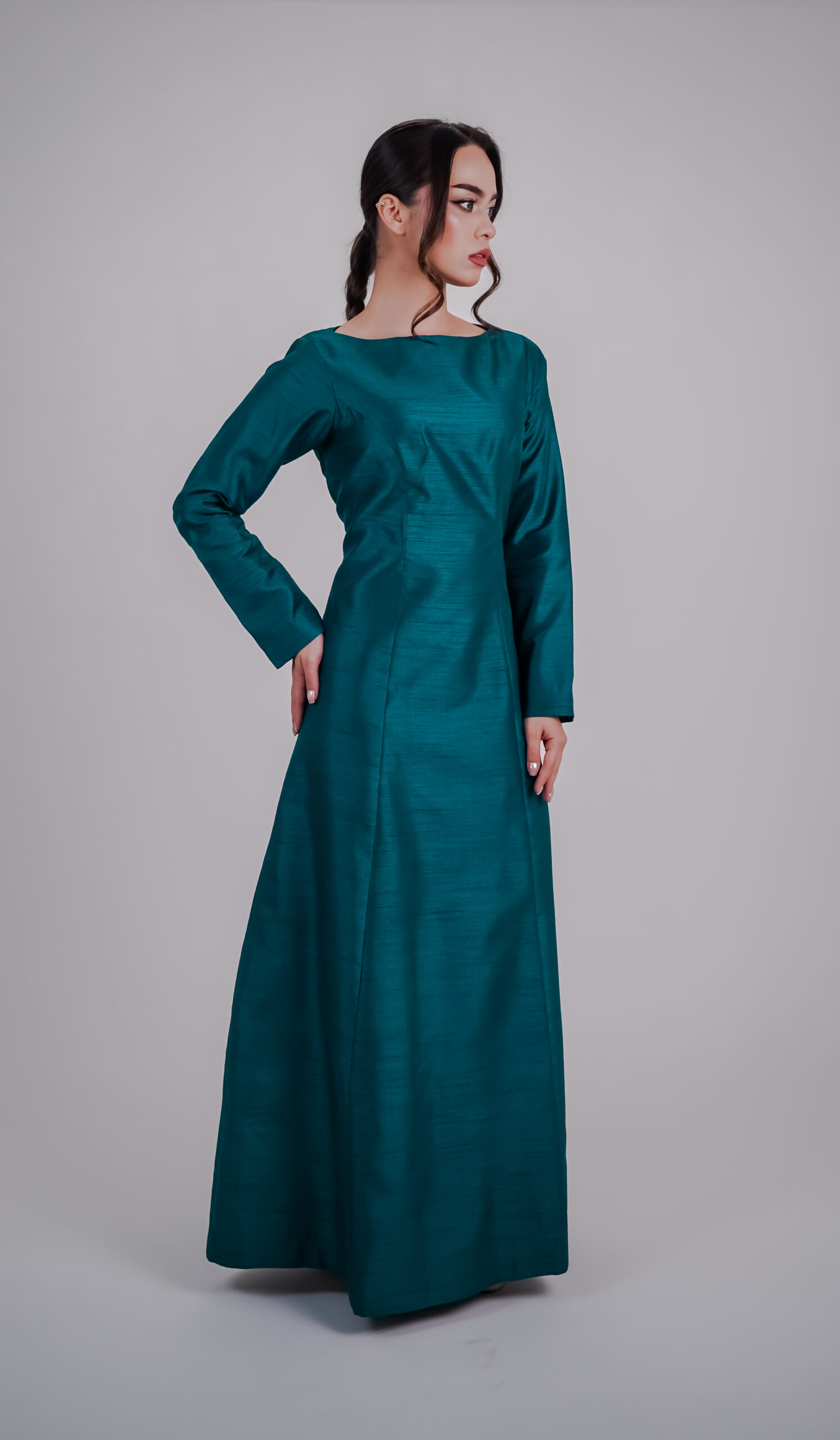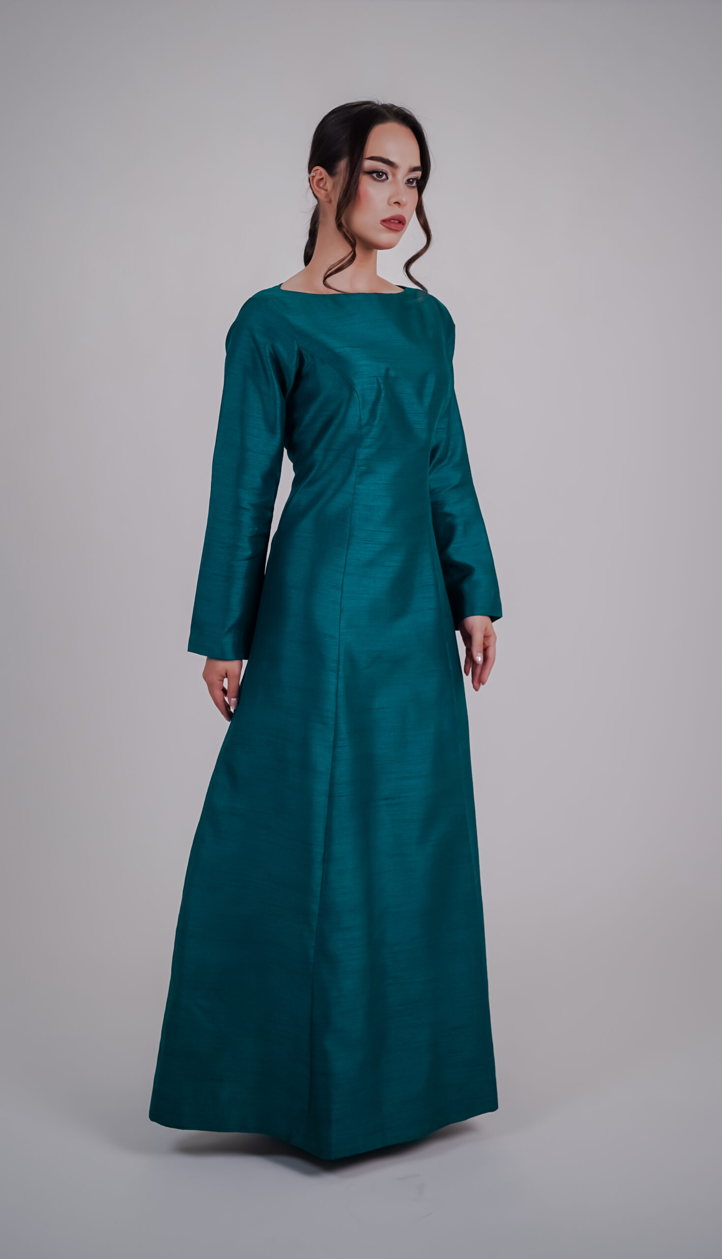 فستان أنيق طويل باللون التركوازي، يتميز بالبساطة والفخامة، مع رقبة دائرية كلاسيكية.