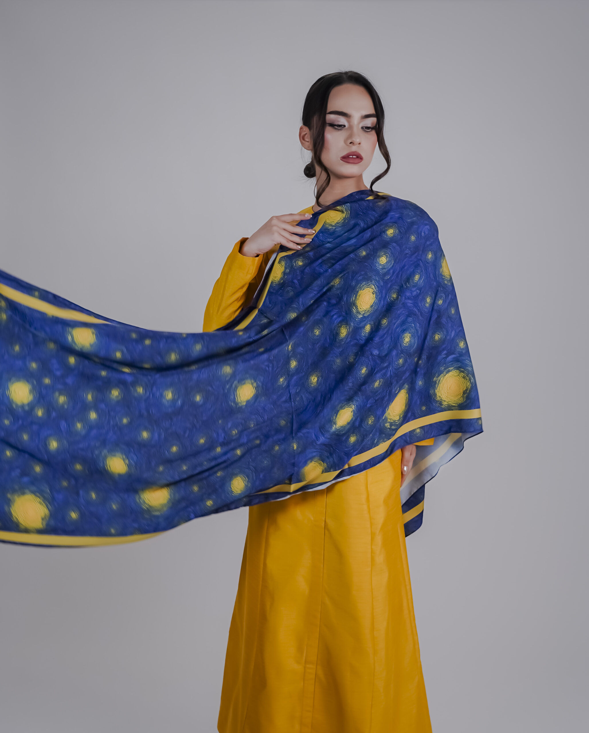 سكارف فاخر ضمن مجموعتنا الفاخرة المستوحاة من أعمال الفنان العالمي فان جوخ، حيث يلتقي الفن بالأناقة في تصميم استثنائي ينبض بالرقي.