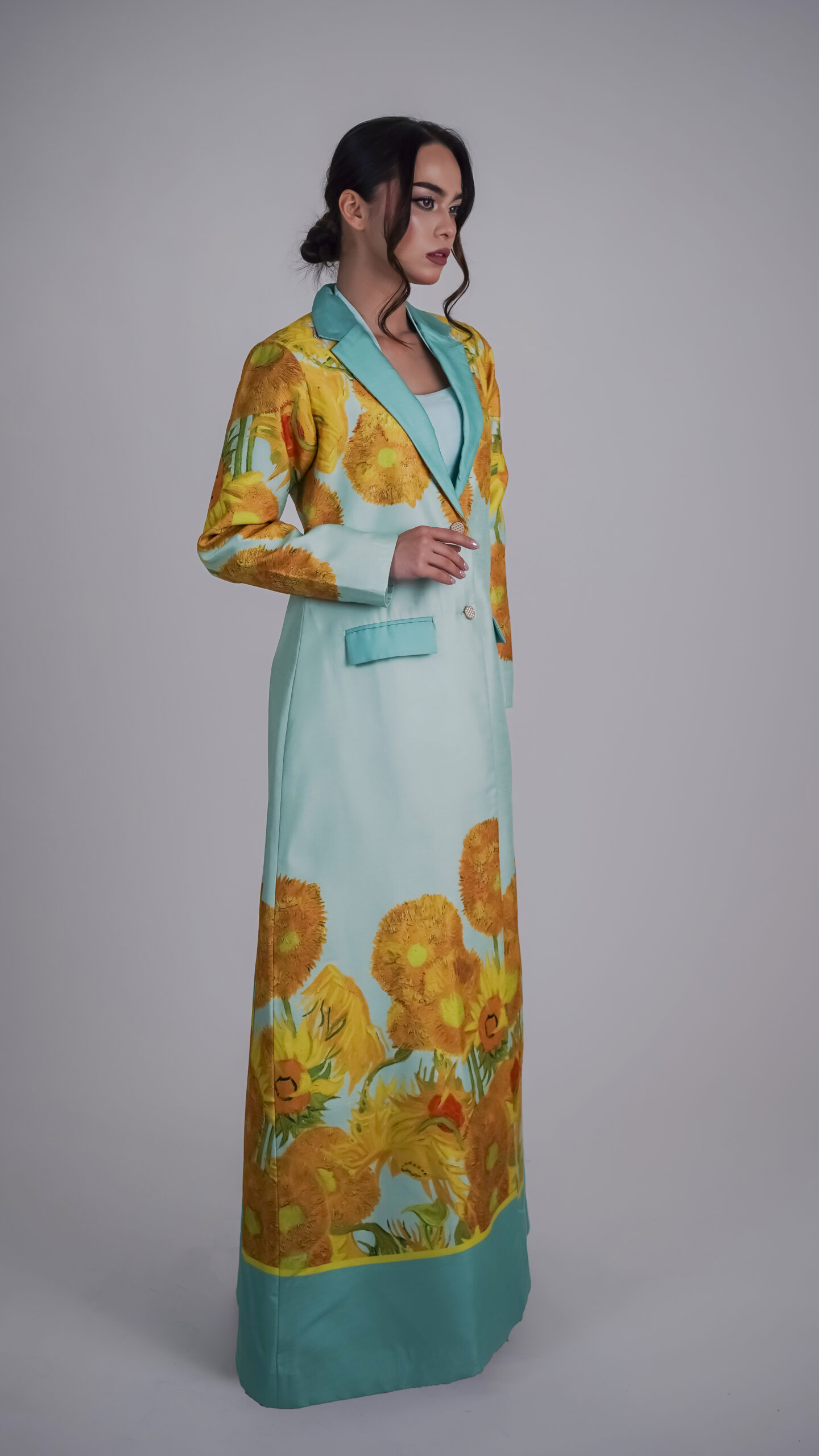 عباءة فاخرة بتصميم أنيق مستوحى من لوحة فان جوخ “Sunflowers”، تتخللها طبعات بانسيابية مستوحاة من الزهور المشرقة، تضفي عمقًا ورقيًا على الإطلالة.