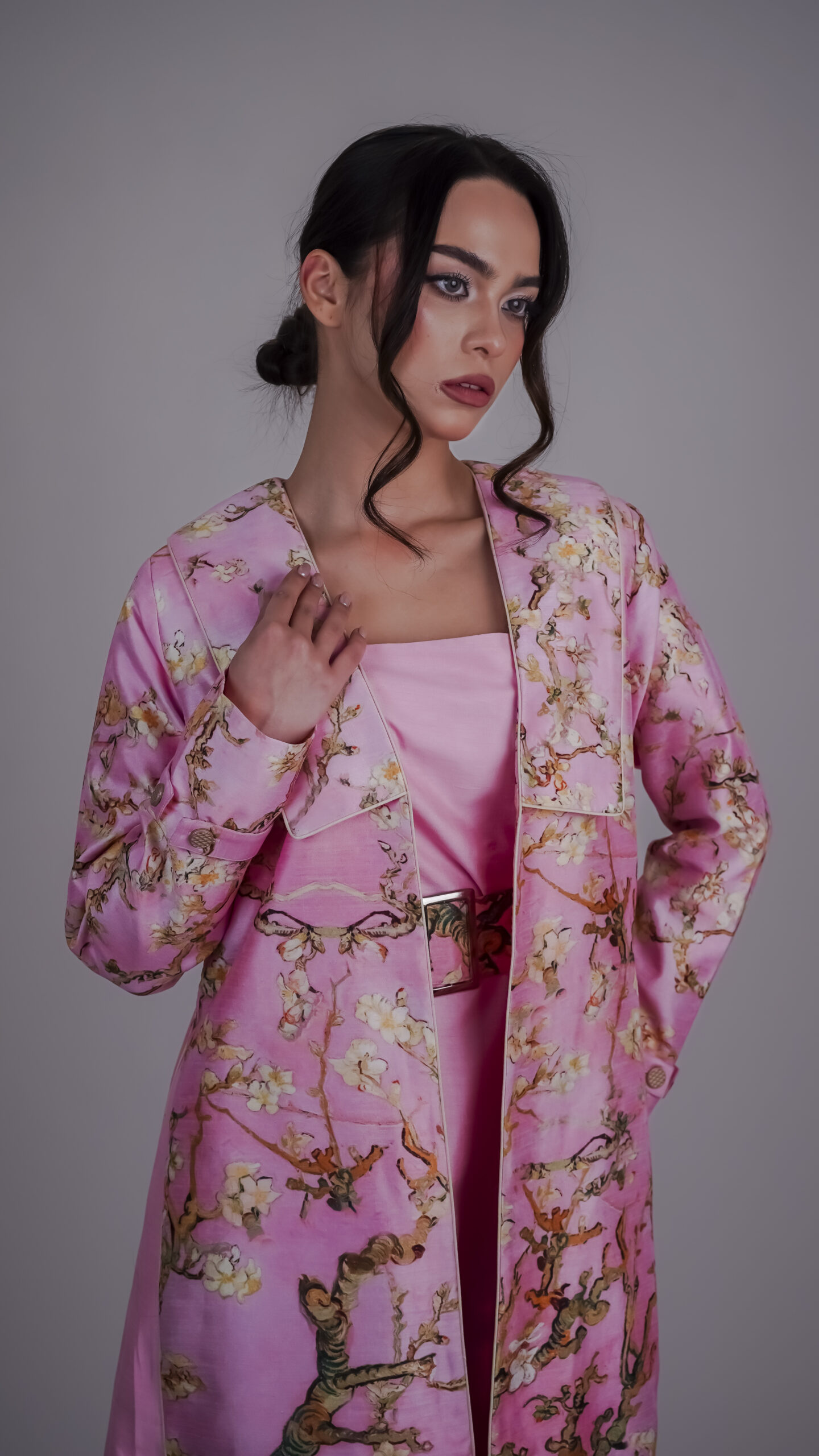 عباءة فاخرة بتصميم أنيق مستوحى من لوحة فان جوخ “Almond Blossoms”، تتخللها طبعات بانسيابية مستوحاة من أزهار اللوز، تضفي عمقًا ورقيًا على الإطلالة.
