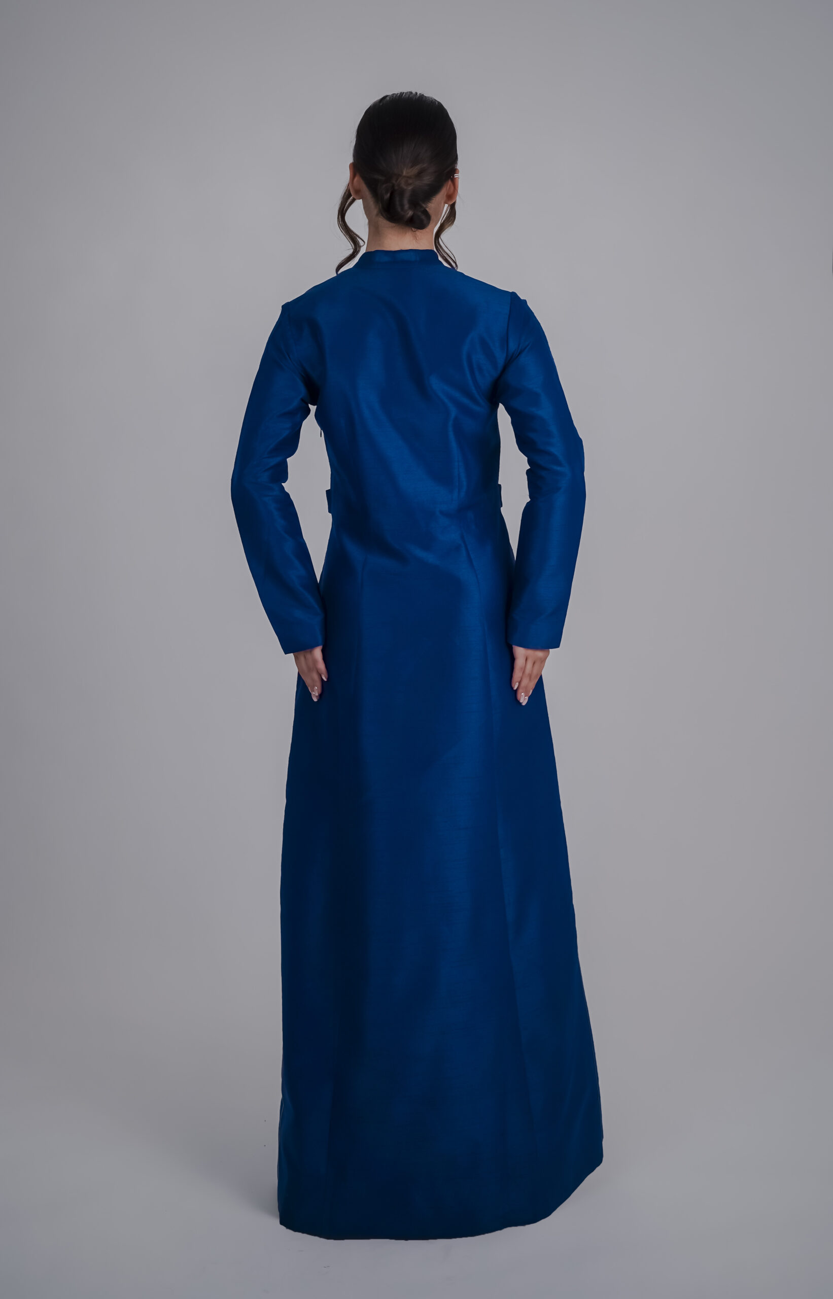فستان أنيق طويل باللون الأزرق الملكي، مزوّد بأزرار ذهبية أنيقة في الأمام مع سحاب جانبي مخفي.